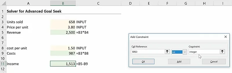 Constraints are the limits you set for your variable cells. Click “Add” in the Solver Parameters window to specify these limits. For our example, set the units sold to be a whole number (integer) and the price per unit to be between 3 and 4.