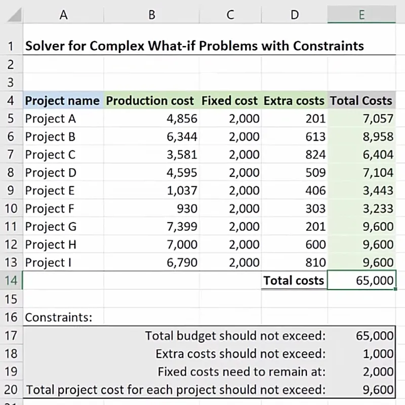 - Extra costs ($D$5:$D$13) must be less than or equal to 1,000 ($E$18).