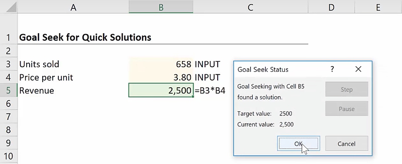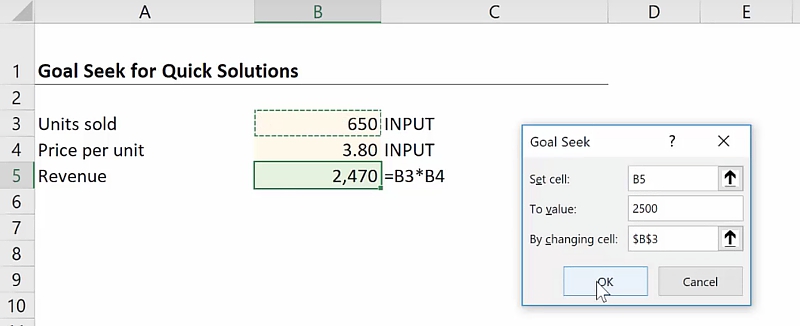 - By changing cell: This refers to the cell that you want to change in order to achieve the target. In this case, you want to figure out how many units need to be sold to achieve a revenue of 2500. Set it as $B$3.