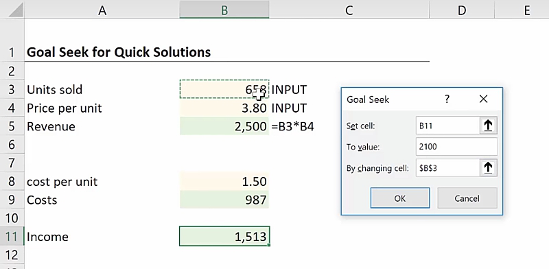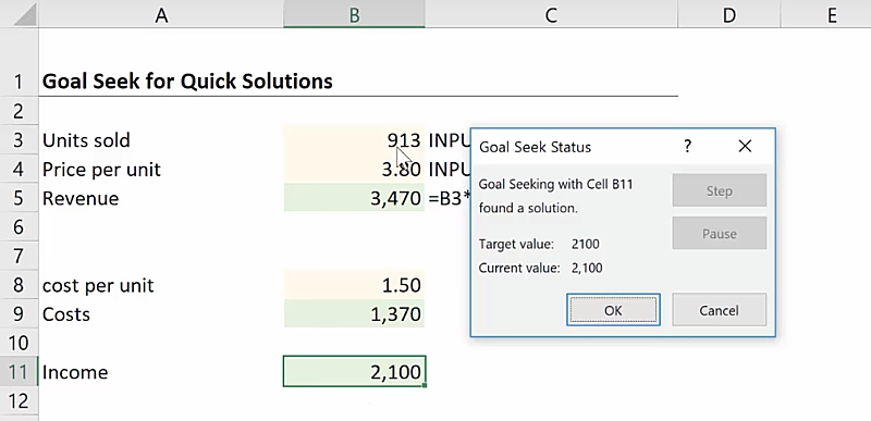 Cell B11 = B5-B9If we want to figure out how many units need to be sold in order to achieve an Income of 2100, the Goal Seek function can be used as well.