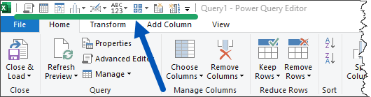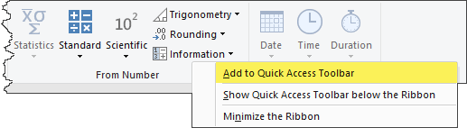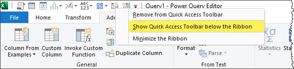 To add a feature to the Power Query QAT, right-click a feature on a ribbon and choose “Add to Quick Access Toolbar”.
