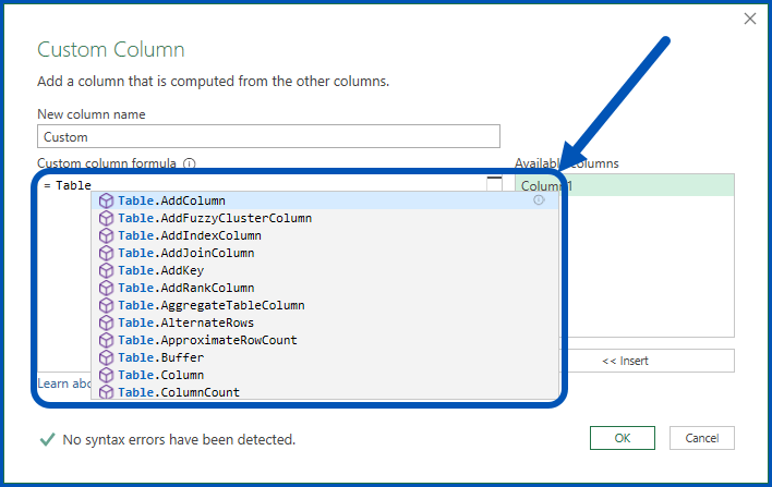 When writing formulas using Power Query functions, we are presented with the same formula writing assistant known as IntelliSense. This is the service that offers suggested function names as well as helpful insights into the needs of a function.