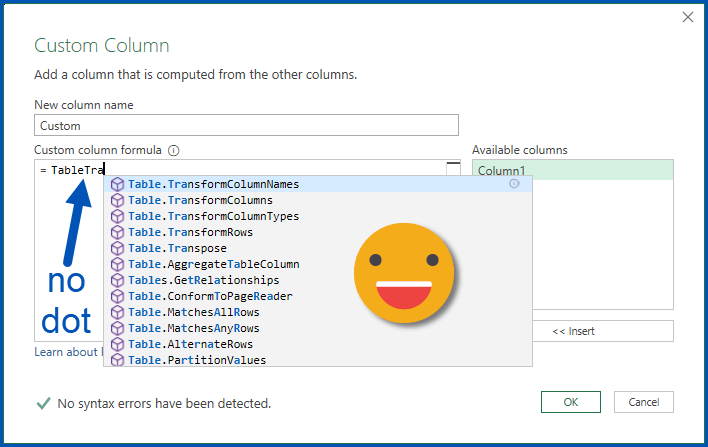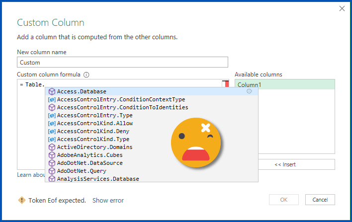 Power Query’s IntelliSense service is going through a bit of an awkward teenage phase where it thinks it knows what to do but often gets a bit confused.
