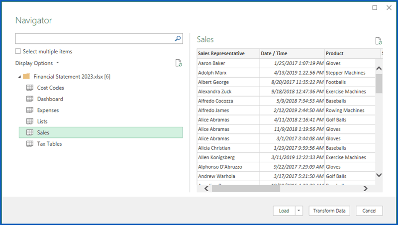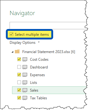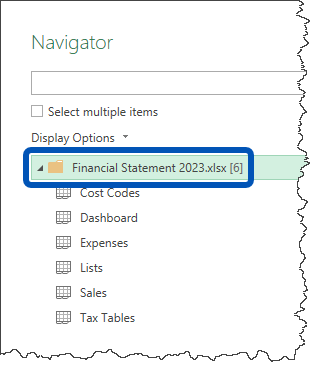 When working with the “From Excel Workbook” data connector, an initial list of all sheets, tables, and ranges is presented in a Navigator window. This allows the user to select which worksheet, table, or range of data to be brought into Power Query for transformations.