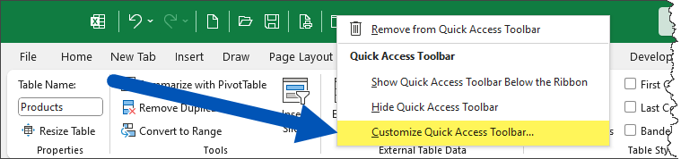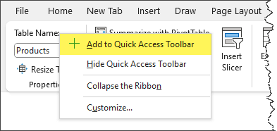 Alternatively, you can right-click “Table Name” in the Table Design Ribbon and click “Add to Quick Access Toolbar” to add the feature to the QAT.