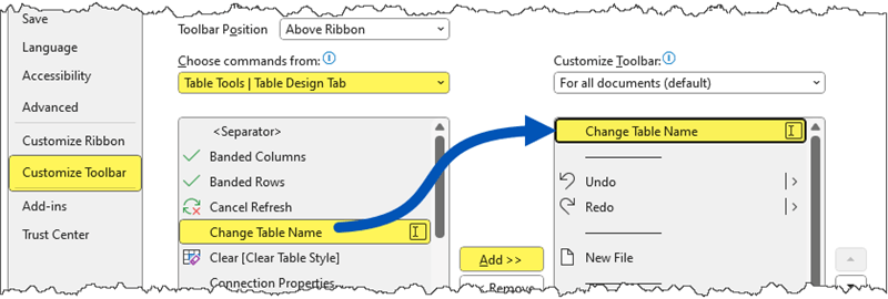 - In the Customize Toolbar section, set the “Choose Commands From” dropdown to “Table Tools | Table Design Tab”. Select “Change Table Name” from the list and press the Add button (middle) to place the option on the right-side table. Click OK when done.