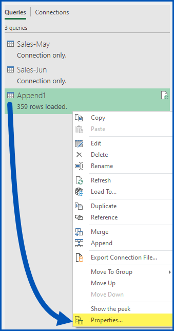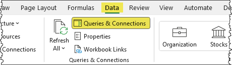 This refresh process can be automated by opening the Queries & Connections panel (located on the Data ribbon), then right-clicking a query and selecting Properties.