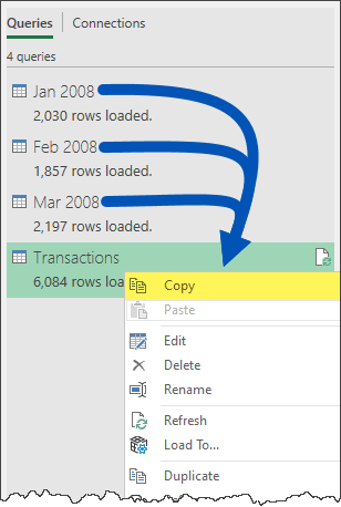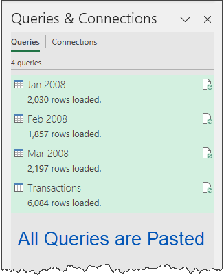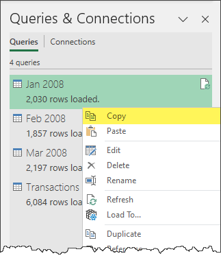 Open a file with the source query and display the Queries & Connections panel (located on the Data ribbon).