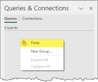 Navigate to the destination file, activate the Queries & Connections panel, then right-click in an empty part of the panel to select Paste.