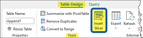 To add a Slicer to a proper Excel Data Table, click the table, then select Table Design (tab) – Tools (group) – Insert Slicer.