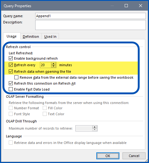 In the Query Properties dialog box, select the best refresh option that meets your needs.