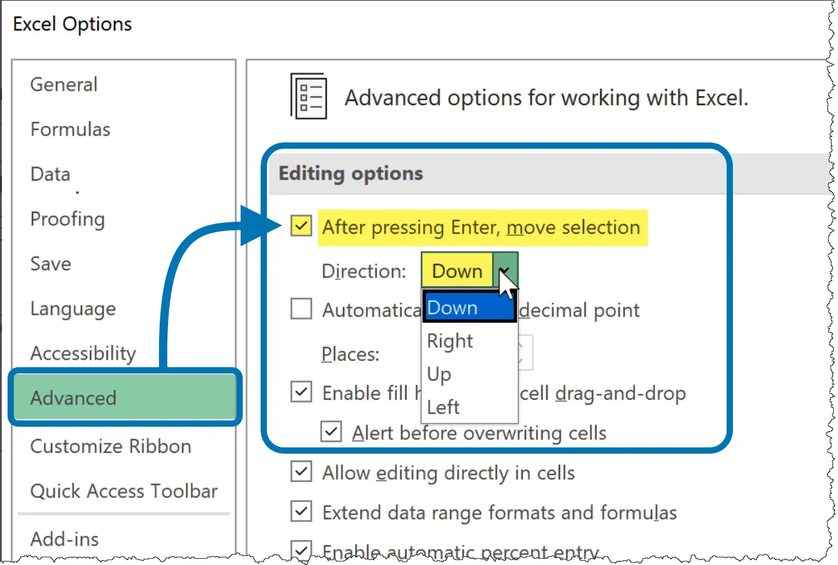 - In the Editing Options section, find the dropdown for “After pressing Enter, move selection.” Choose your preferred direction or uncheck the box to stay in the current cell.