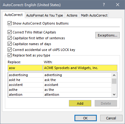 Wouldn’t it be easier to type “ASW” and have Excel change it to “ACME Sprockets and Widgets, Inc.”? This is possible with the AutoCorrect feature.