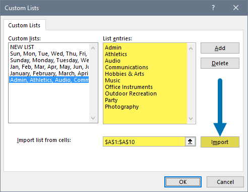 - The highlighted range should appear in the “Import list from cells:” field. Click Import to add the list to your Custom Lists library..