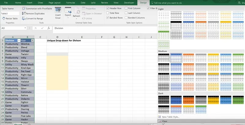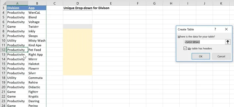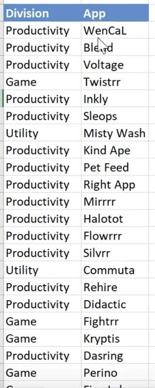 In this example, we will be taking a data set with different Divisions, along with the Apps that belong to each division.