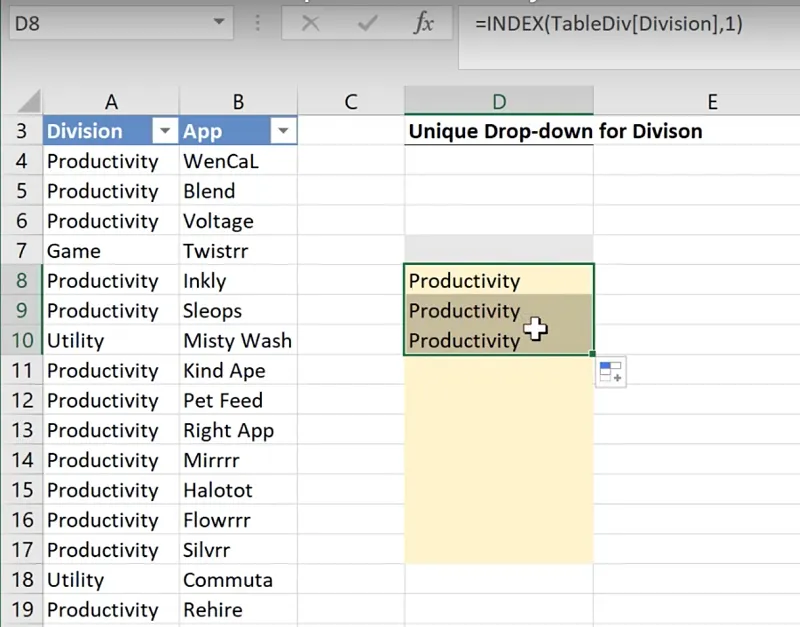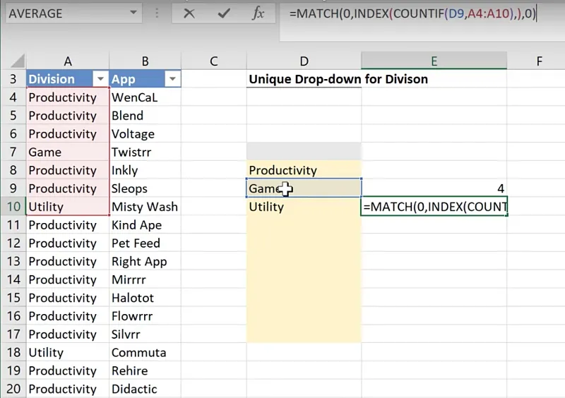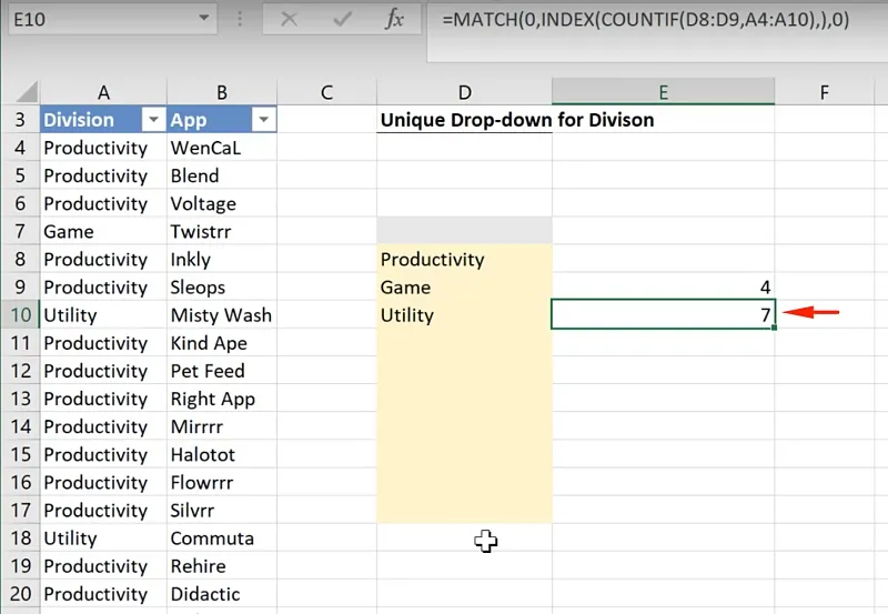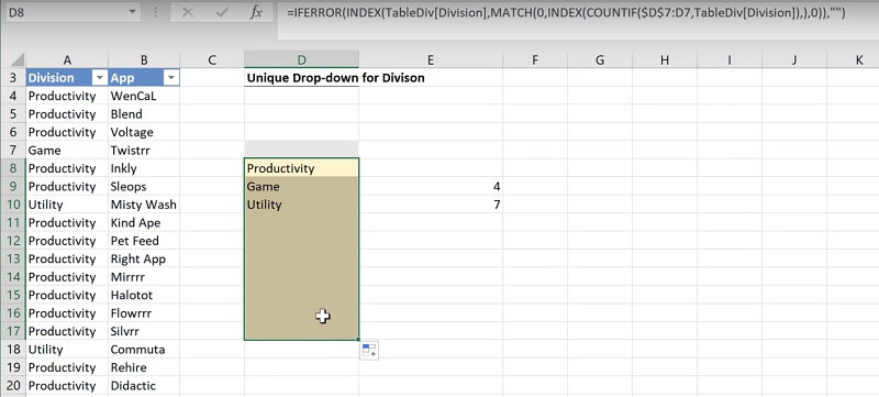 MATCH(0,INDEX(COUNTIF($D$7:D8,TableDiv[Division]),),0))When you pull this formula down to the last row, it now displayed unique Division names.
