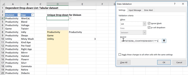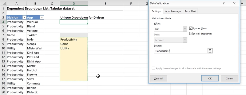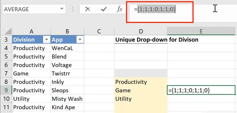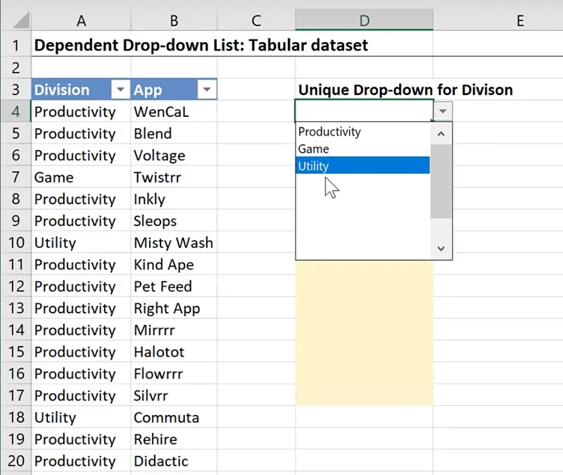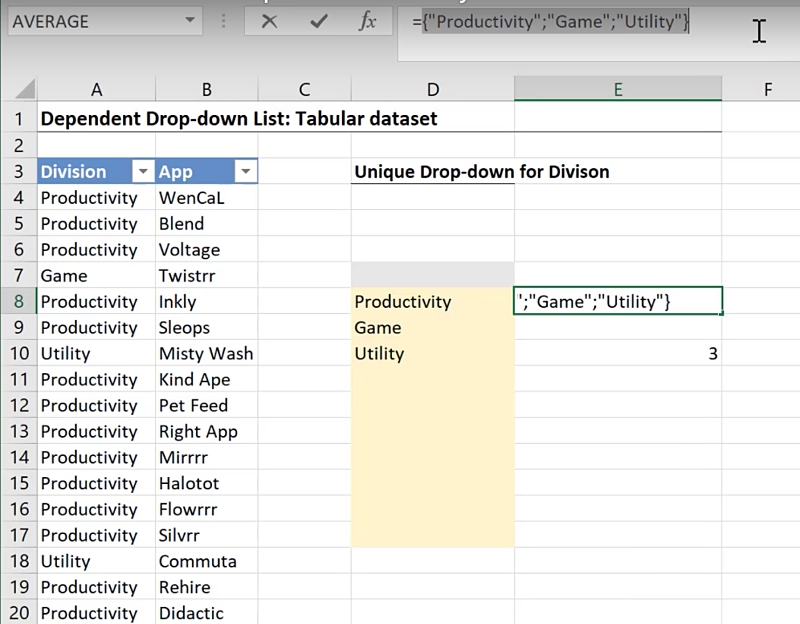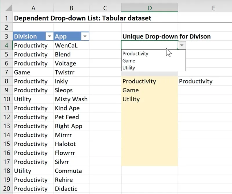 From the D8:D17 range, it displays the three values: “Productivity”, “Game”, and “Utility”.