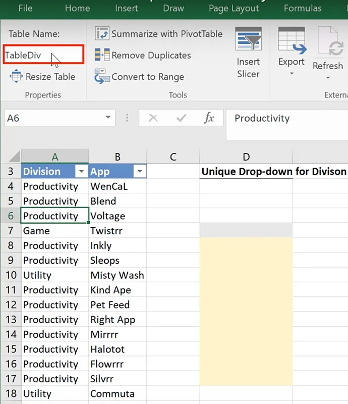 You can test this out by adding new Division values in the table and see if the dropdown is updated accordingly with no duplicates.