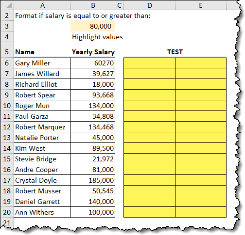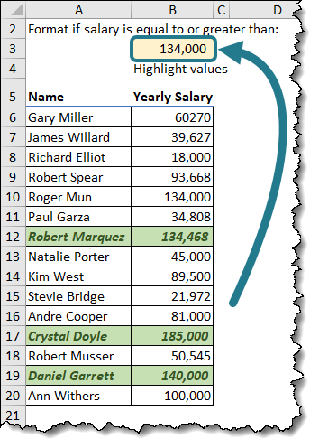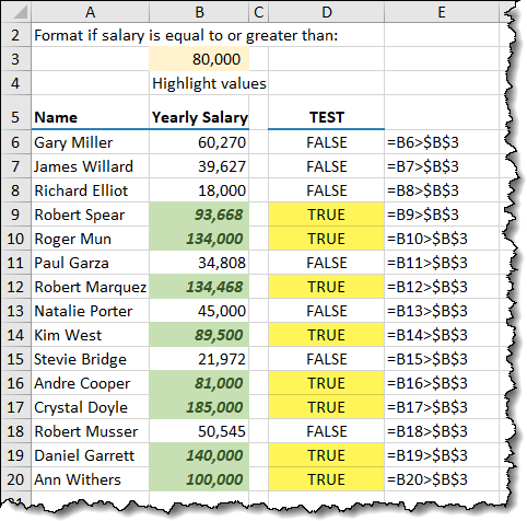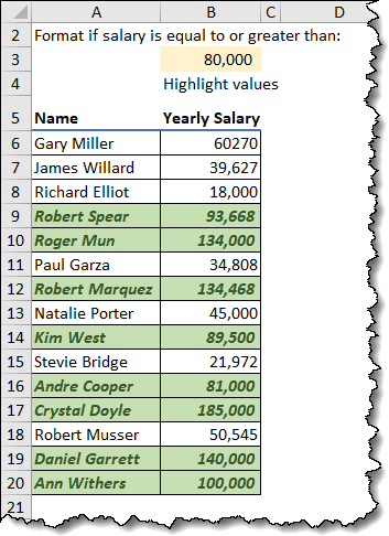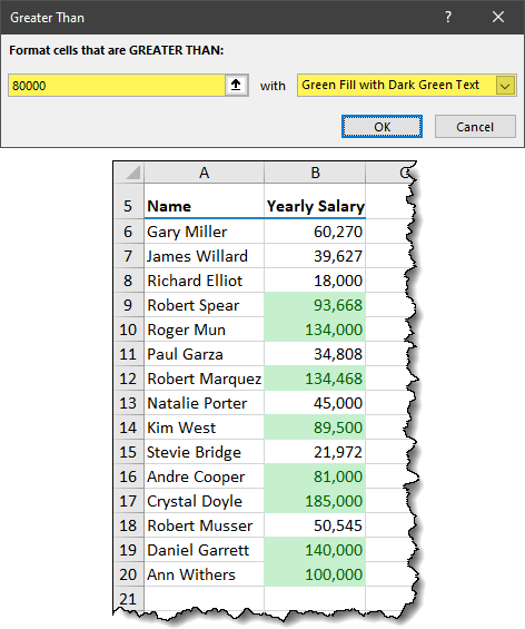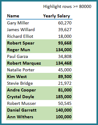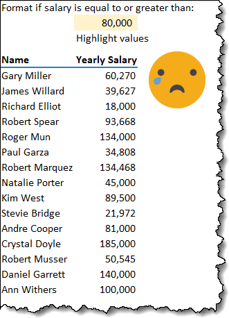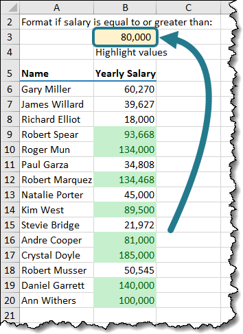 For most users, Conditional Formatting is used to draw attention to cells where the cell’s value meets a defined criterion, such as “greater than 80,000”.