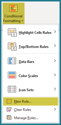 - Select Home (tab) -> Styles (group) -> Conditional Formatting -> New Rule.