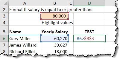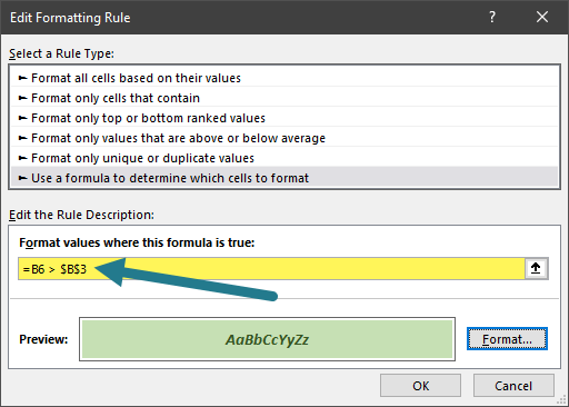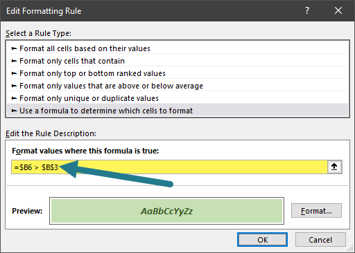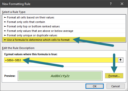 =$B$6 > $B$3- Click the Format button to open the Format Cells dialog box to set font color, fill color, and/or border styles as desired.