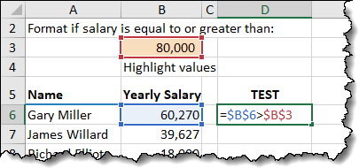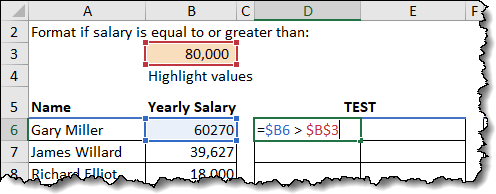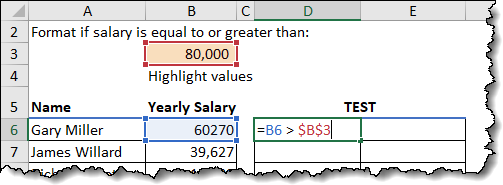 The solution to this problem is to have the cell reference being tested (cell B6) set as a relative reference while leaving the user’s cell value (cell B3) reference set as an absolute reference (i.e. “fixed” or “locked”).