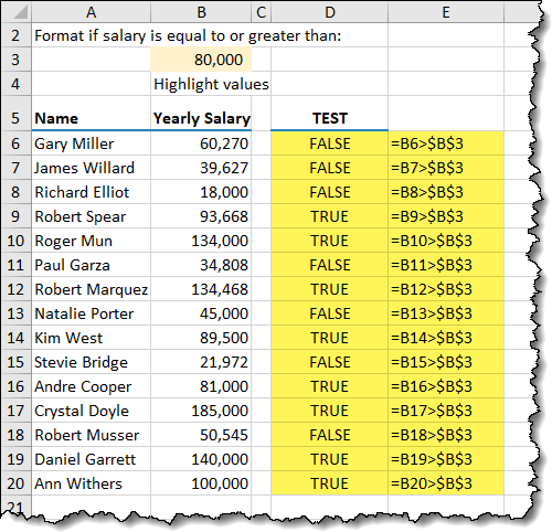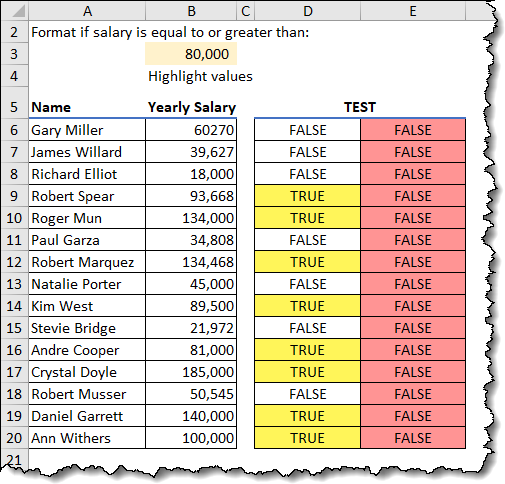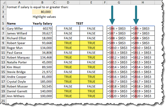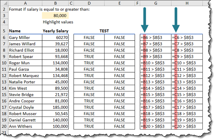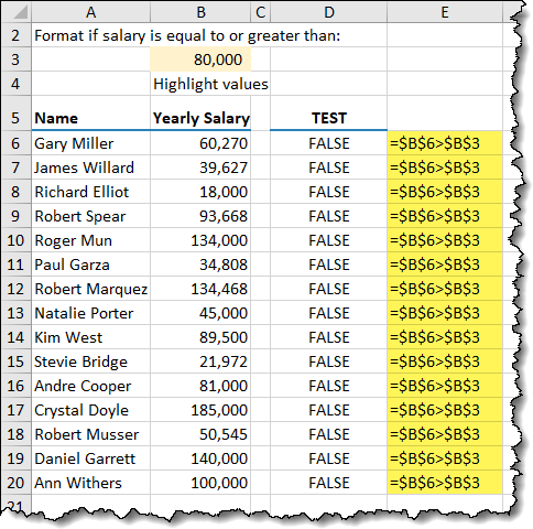 The key takeaway here is that whatever formula is needed for the first cell in the dataset, that is the formula needed by Conditional Formatting to perform the same test.