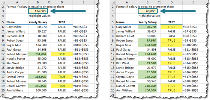 If the user were to enter a new value in cell B3, the Conditional Formatting rule updates automatically to reflect the new logic.