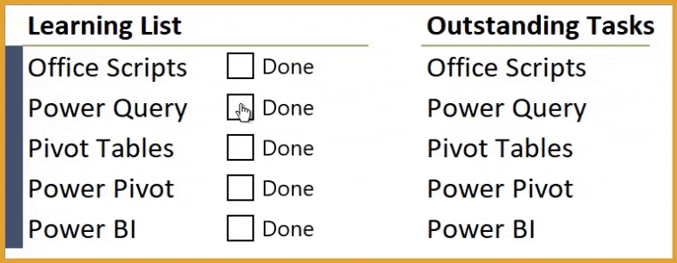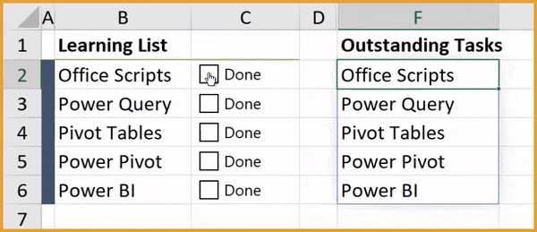 If you want a list of tasks or skills you haven’t finished yet, you can use the FILTER function. This helps make a list of things marked as “False” in the checkbox column.