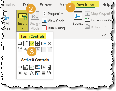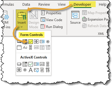With the Developer ribbon displayed, in the Controls group, select Checkbox in the upper group of buttons labeled Form Controls.