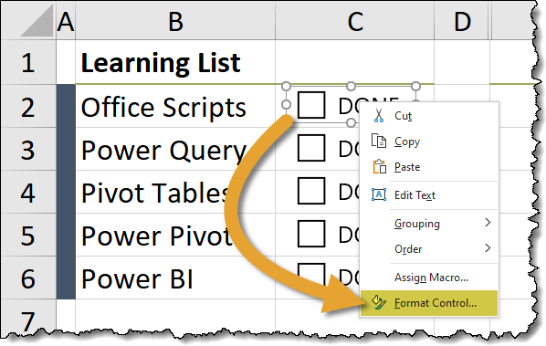 NOTE: This “Format Control…” step must be repeatedly performed for each of the checkboxes, with each checkbox pointing to a different cell link location.