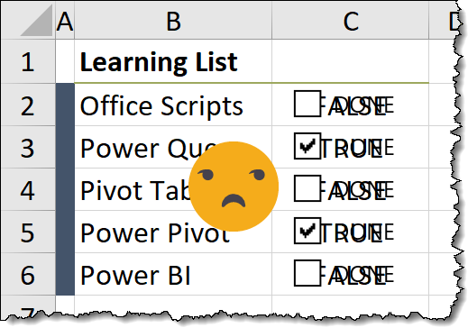 Place a check in each checkbox. You will see the words “TRUE” in the cells behind the labeled checkboxes. Remove the check marks and you will see the words “FALSE”.