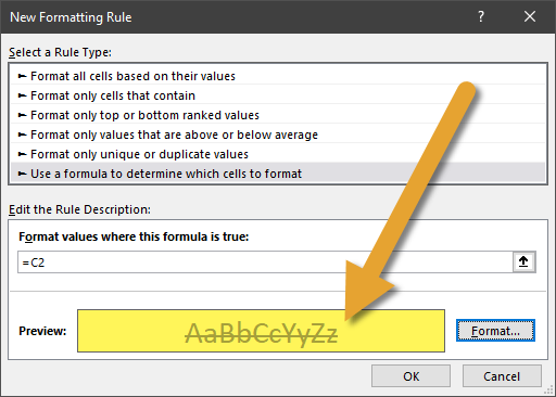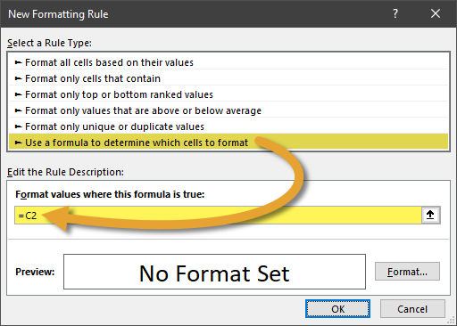 Step 3: In the New Formatting Rule dialog box, select “Use a formula to determine which cells to format”. Enter the cell address of the first cell that holds a true/false response (ex: =C2).