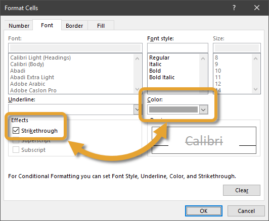 Step 4: Click the “Format…” button to open the Format Cells dialog box. Set the style to whatever format pleases you. I’m going to go with a strikethrough font that is a medium gray color.