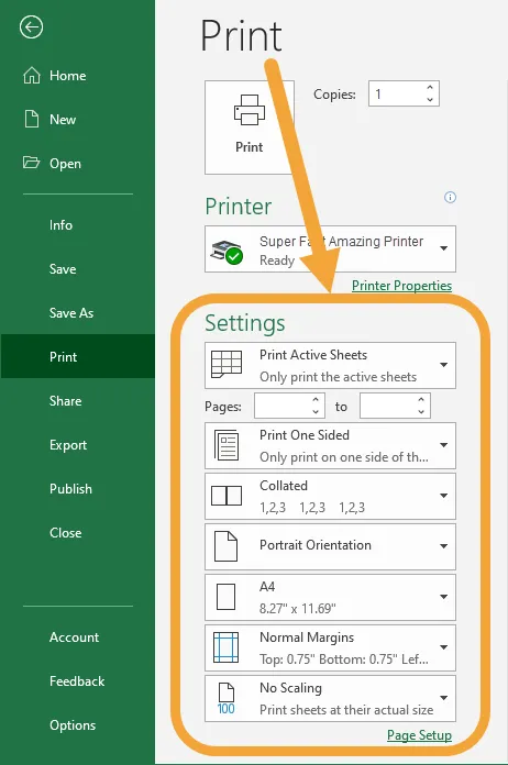 Most print options can be set either in the Print window of the Backstage or from the Page Layout ribbon.