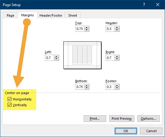 Excel defaults printing to start in the upper-left corner of the sheet. You can center the data left-to-right by centering horizontally or center the data top-to-bottom by centering vertically. You can also center the data on the page by engaging both options.