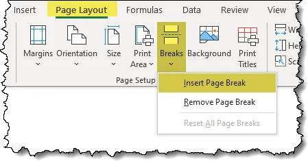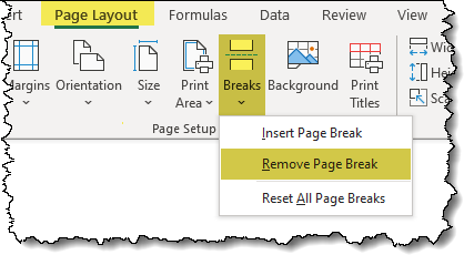 To remove a manually inserted page break, select an empty cell below the page break you wish to remove and select Page Layout -> Page Setup (group) -> Breaks -> Remove Page Break.