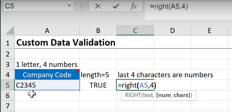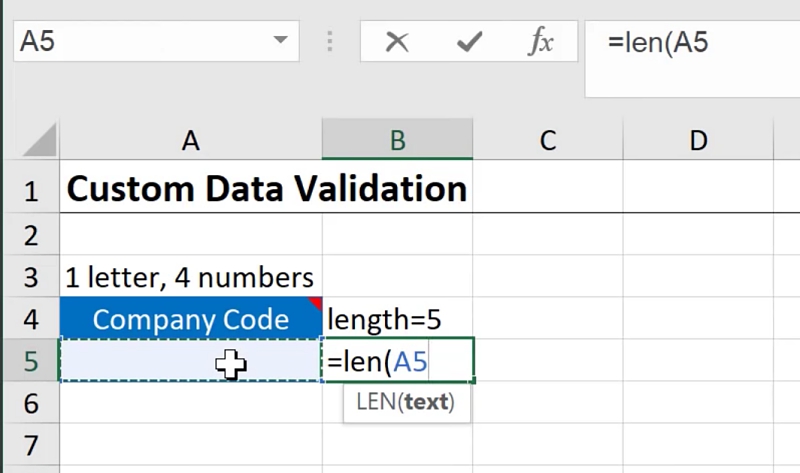 =LEN(A5)=5This will return a TRUE or FALSE result based on the contents of the cell.