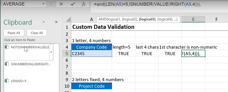 3. In a separate cell, merge the three formulas using the AND() function and selecting the formulas from the clipboard section to insert it.