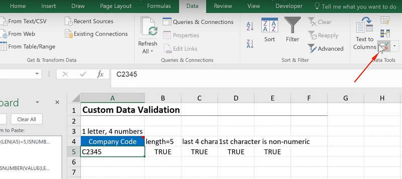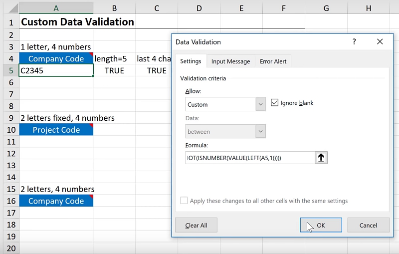 4. Under Data Validation, select Allow: Custom. Paste the formula in the textbox.
