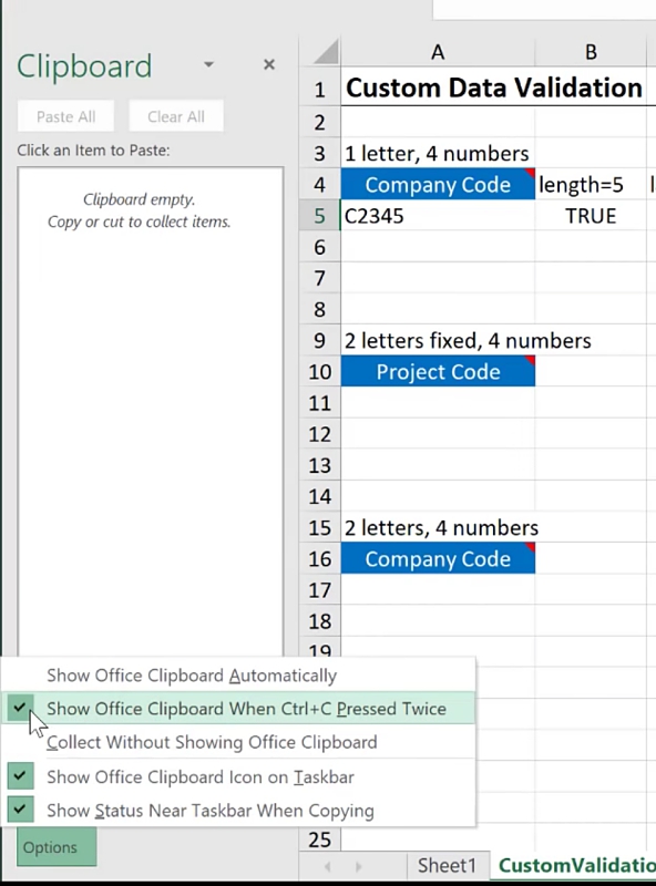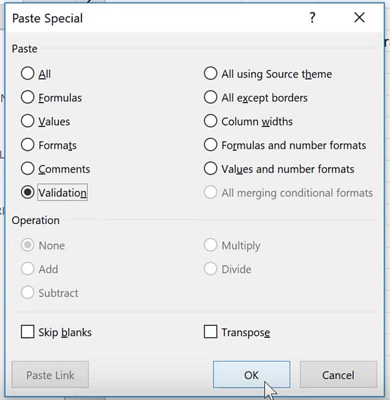 5. If needed, the data validation setup can be copied to other cells by pressing CTRL + C while selecting the cell with the data validation. Highlight the other cells then right click > Paste Special > Data Validation.