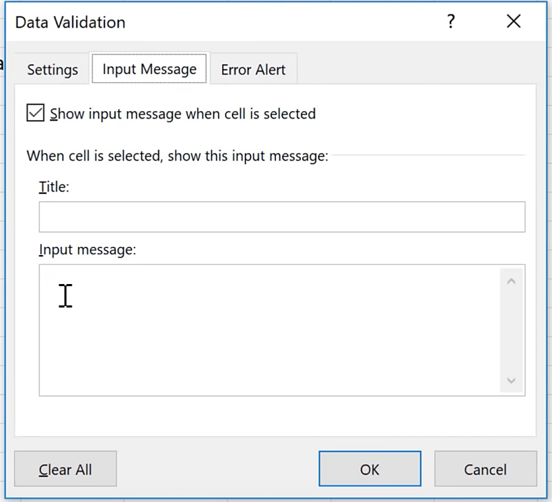6. To add an input message, go back to Data Validation > Input message tab and specify the message to be displayed.