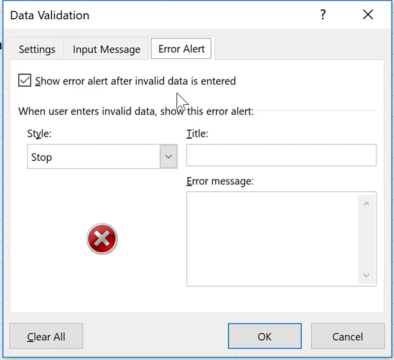 7. To customize the error alert, go to Data Validation > Error Alert tab and fill in the details.