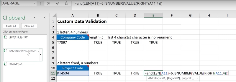 = AND(LEN(A11)= 6, ISNUMBER(VALUE(RIGHT(A11,4))), LEFT(A11,2) =”PT”)