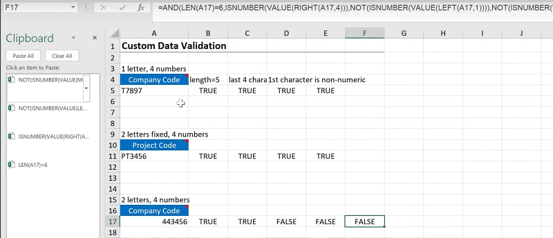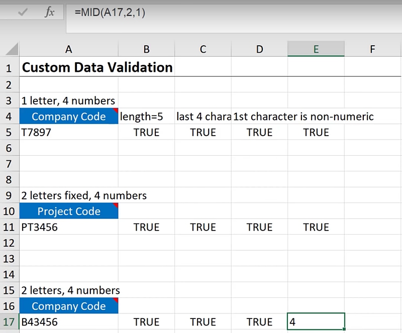 = LEN(A17)= 6 - Last 4 characters are numeric