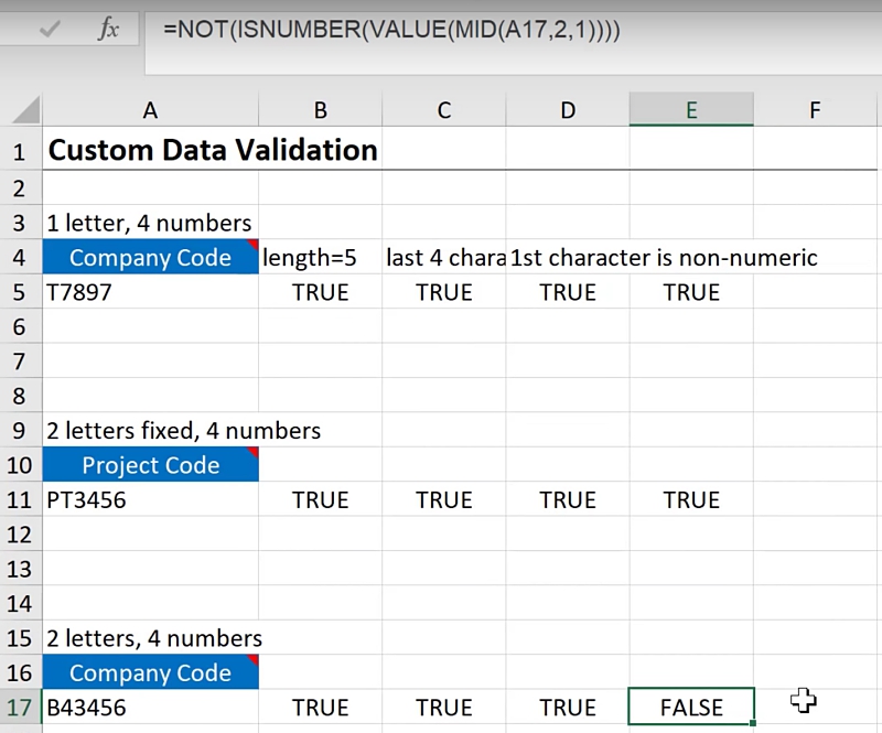 = NOT(ISNUMBER(VALUE(LEFT(A17,1)))) 2. Isolate the second character using the MID() function.