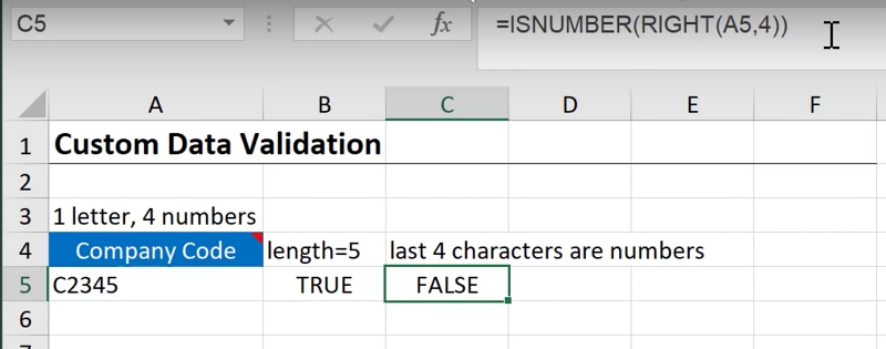 3. However, the result of the RIGHT() function is a text and so the ISNUMBER() function marks this as FALSE regardless of the content.