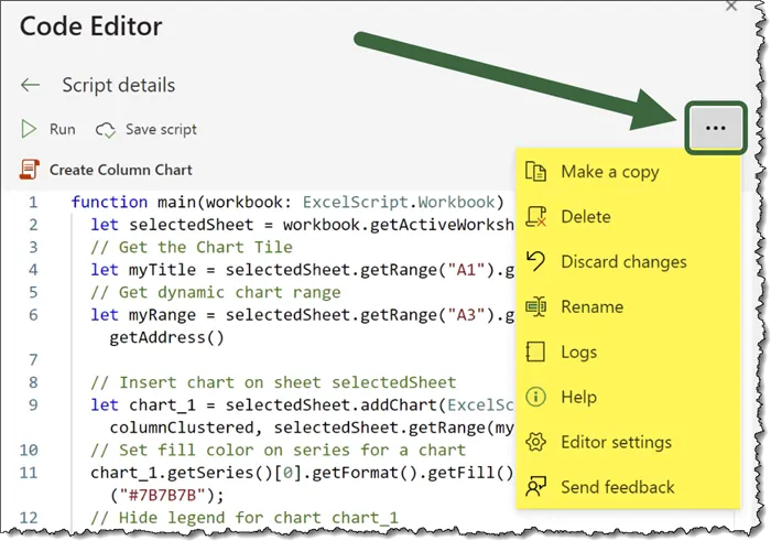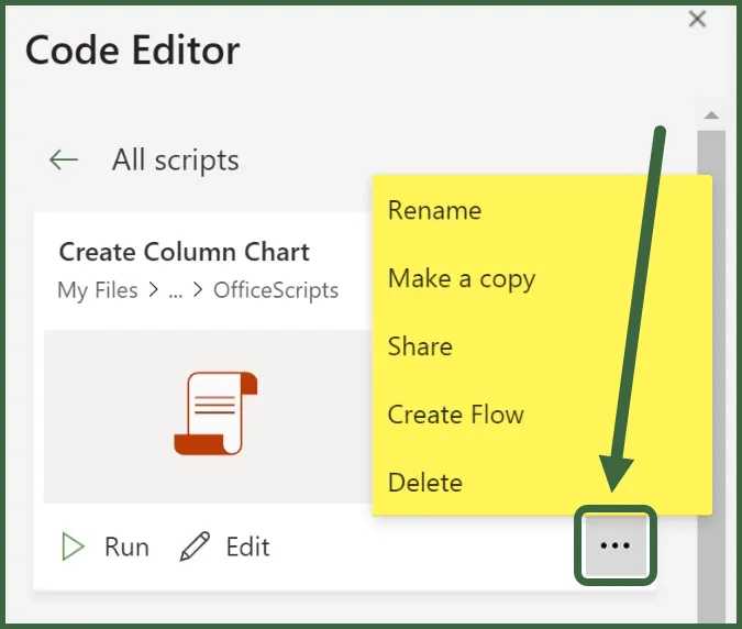 Back in Excel, clicking the Options button (three dots) reveals several administrative options that can be exercised on the script.