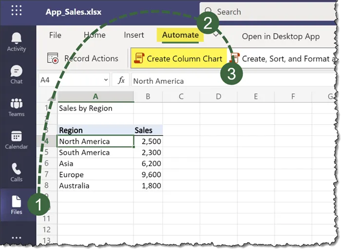 If we switch to Microsoft Teams, browse to our Files section, and open the Excel workbook, we can select the Automate tab just like in Excel for the Web and execute the “Create Column Chart” script.