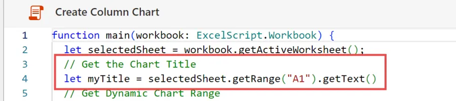 First, we need to capture the contents of cell A1 and store those contents in a variable. We will name our variable “myTitle”.